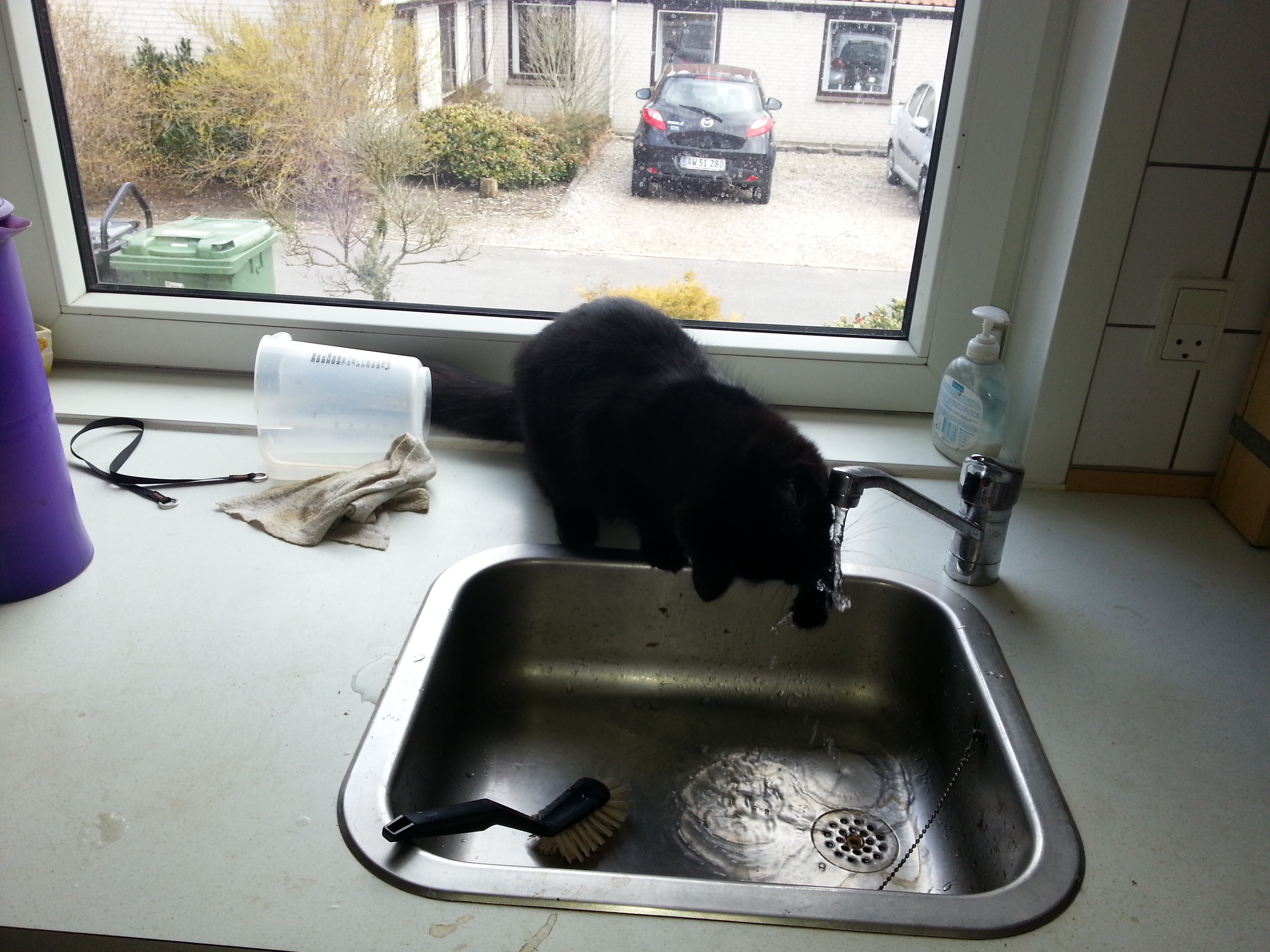 Kattene hygger også Ophelia er blevet en rigtig vandhund og det kan ind i mellem være lidt svært og lave noget i køkkenet for lige så snart hun hører vandet løbe, så står hun med hele overkroppen under det rindene vand.